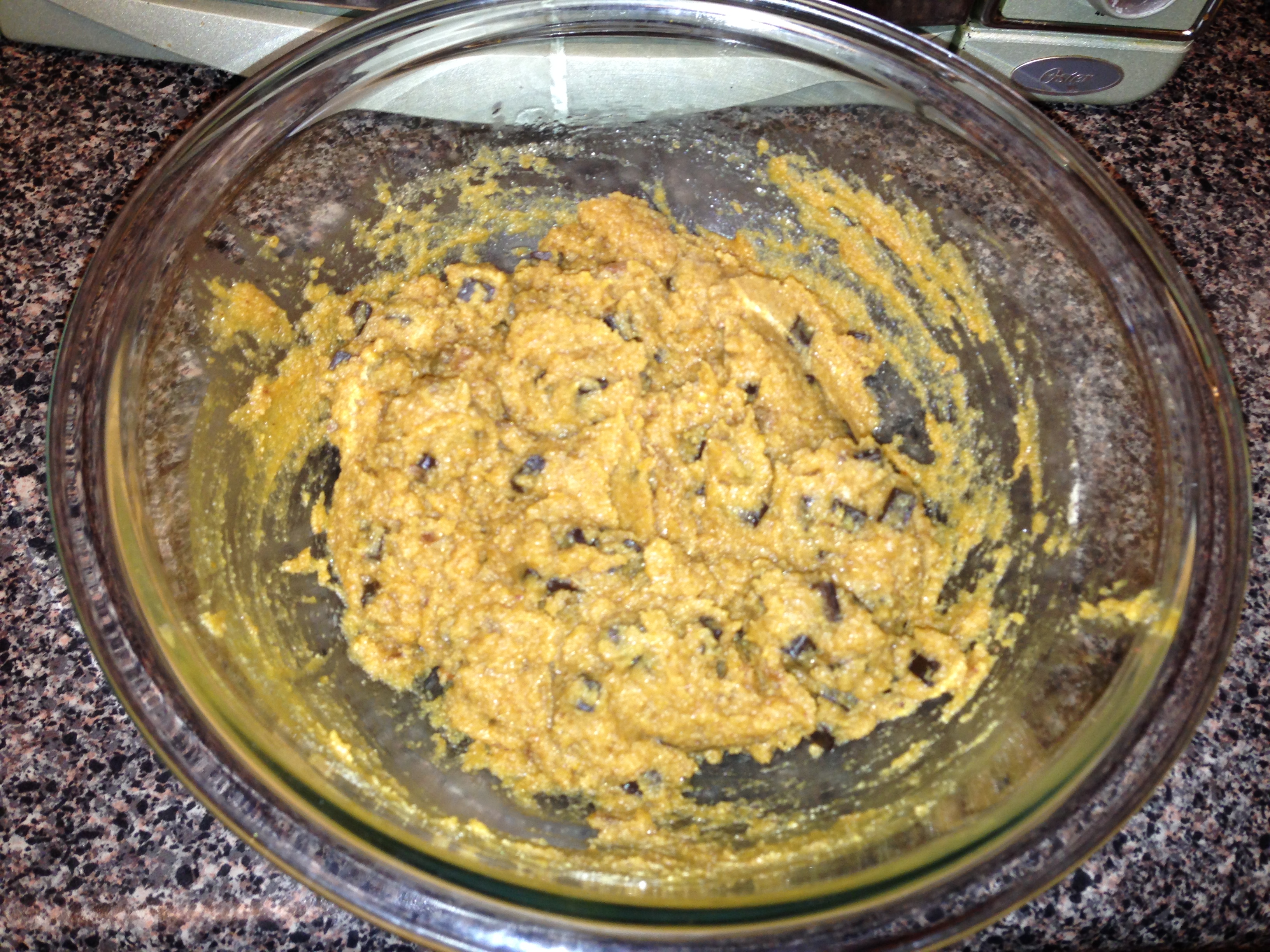 Add the melted coconut oil. Add the dark chocolate chips. Stir into the mixture.
