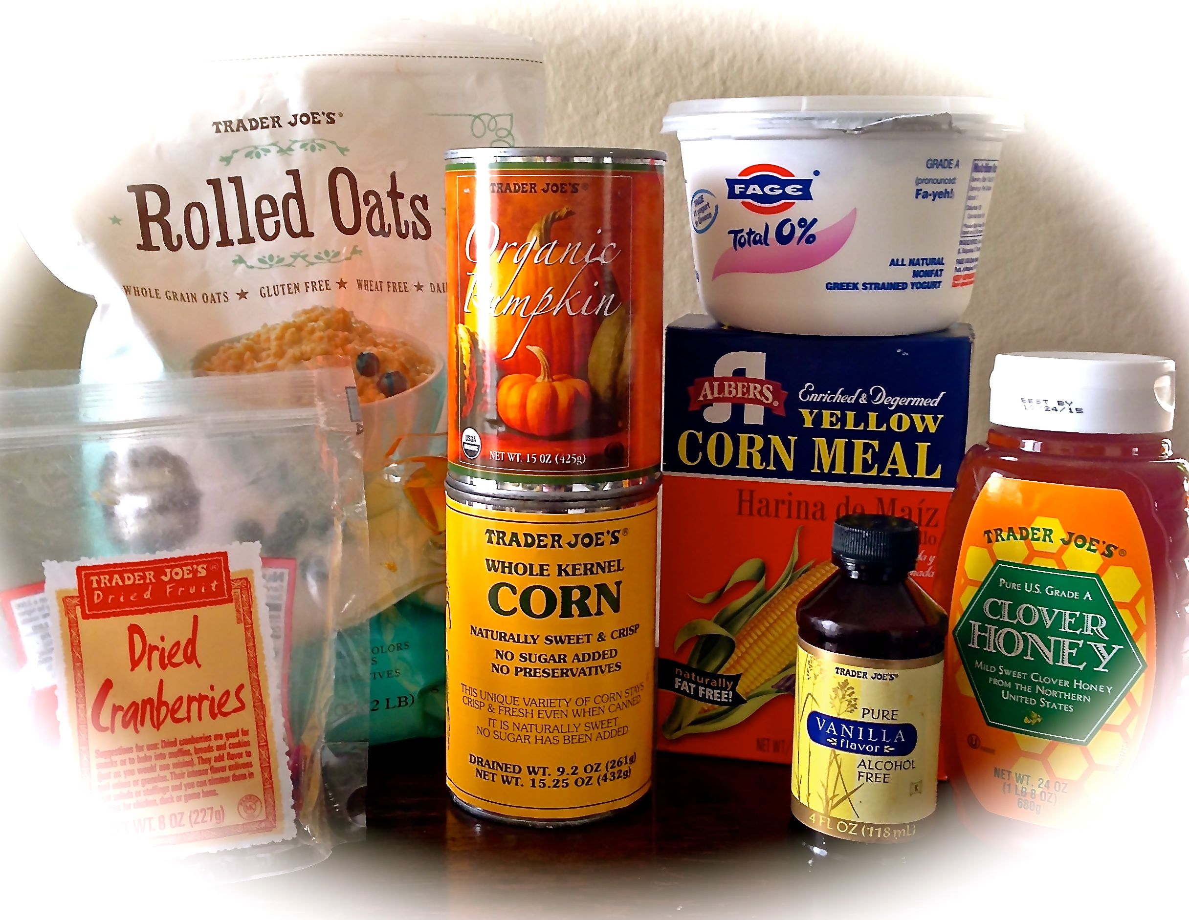 Preheat oven to 375° F.  In a large bowl, mix the cornmeal, corn flour (or oat flour), baking powder, and baking soda with a fork, removing all lumps.  In a separate bowl, mix the egg and Greek yogurt until contents resemble a smooth consistency.  Gradually pour the egg and yogurt mixture into the bowl containing the dry ingredients, and stir until mixture is well-combined.  Add the honey, vanilla extract (optional), pumpkin puree, and corn to the mixture.  Thoroughly stir all contents in the large bowl.  Spray either muffin pan or medium-sized Pyrex dish with non-stick cooking spray.  Pour cornbread mixture into the pan or dish.  Optional:  Add dried cranberries and/or pumpkin seeds to the top of the cornbread for additional flavor.