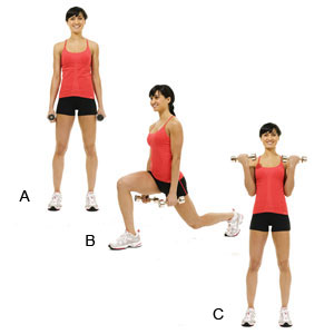 - Step forward with left foot, lowering right knee and until left thigh is parallel to floor.