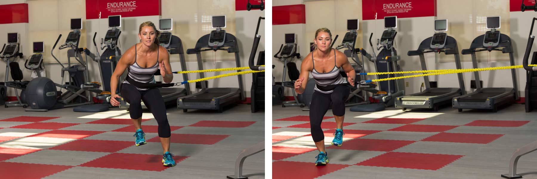 Firmly secure a resistance band to a stable surface (or flag down a certified personal trainer) and loop the other end around your waist. Walk out far enough to create sufficient tension on the resistance band to keep it straight. From a single-leg crouched position (standing leg is closest to the anchor point), push out to the side landing farther away from the anchor point and hold on the outside leg (leg farthest from anchor point). Push back to the starting position and hold. Maintain balance (3-5 seconds) at each position before pushing back to the other side. To burn more calories, push off more quickly (maintain balance for 1-2 seconds), while staying in control.