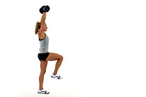 Maintaining single-leg balance, push dumbbells overhead, extending arms (avoid locking out elbows).