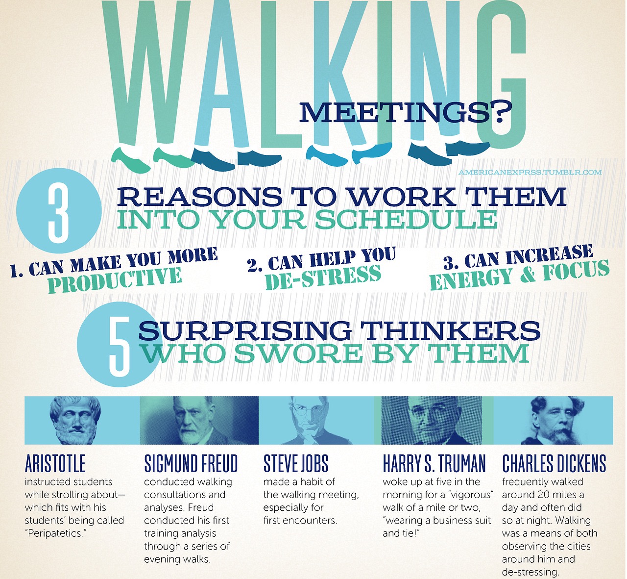 - Schedule business meetings as “walking meetings” – Go far a walk instead of sit in a conference room!