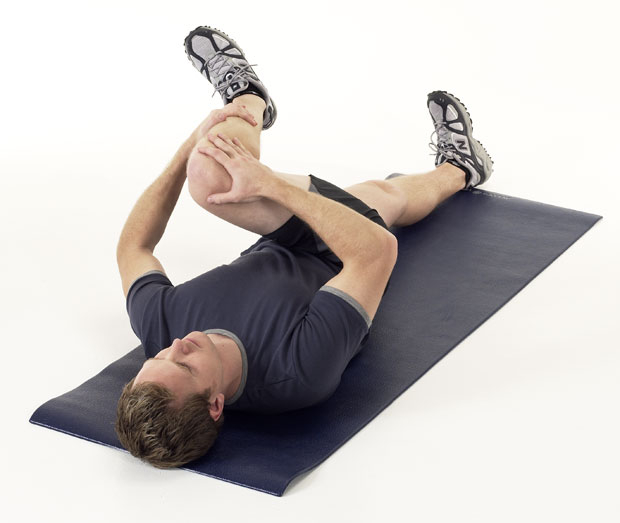 Position body on back (supine) with legs extended and feet flexed. Lift right leg and clasp hands behind the knee. Gently pull right knee across the body and toward the left shoulder. Breathe deeply and hold for 30 seconds (for 1 repetition). Perform 3 repetitions and switch to left side.