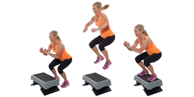 Start in a deep squat position with sturdy platform (eg. step or box) in front and arms bent next to the sides of the body. Swing the arms and jump as high as possible. Landing softly and with control in a squat position on the platform. Make sure both feet land at the same time, placing weight in heels. Jump or step off platform, and return to the start position. Quickly repeat exercise. Perform as many repetitions as possible for 30 seconds.