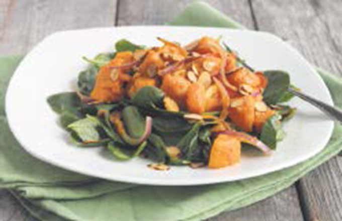 Yield: 4 servings (3/4 cup sweet potato salad and 1 cup spinach salad)