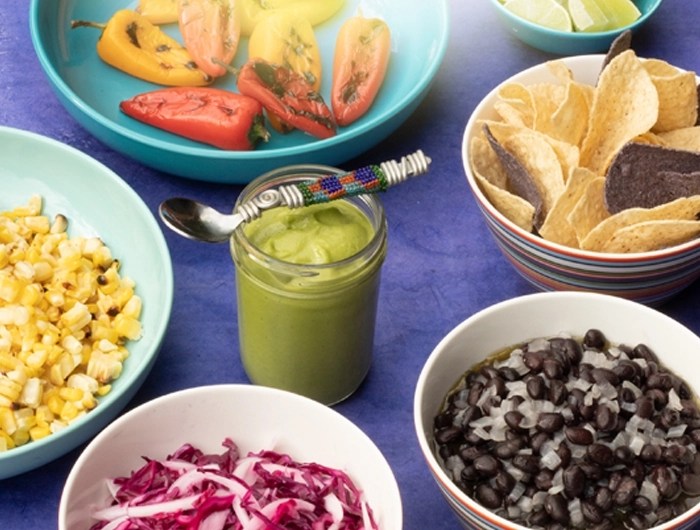 Serve the black beans, cabbage, bell peppers, and corn with the tortilla chips and Avocado Lime Sauce.