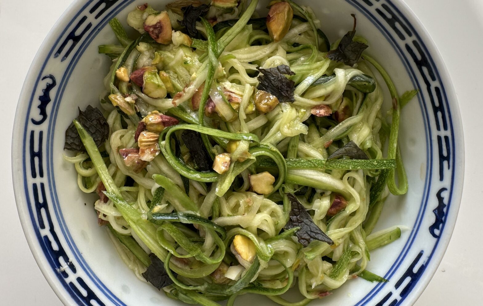 In a big bowl, use a vegetable peeler to peel the zucchinis and make “ribbons” (noodles). *Emma also recommends using a mandoline. Add pistachios and mint.