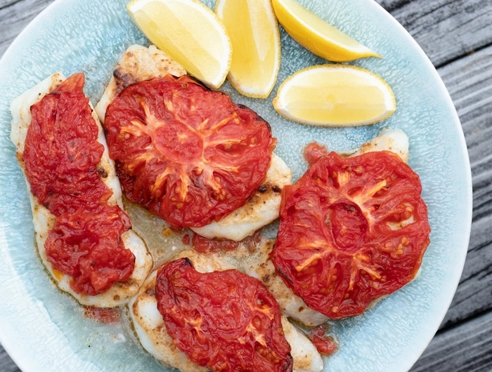 Top the fish fillets with the tomato slices. Serve with the lemon wedges.