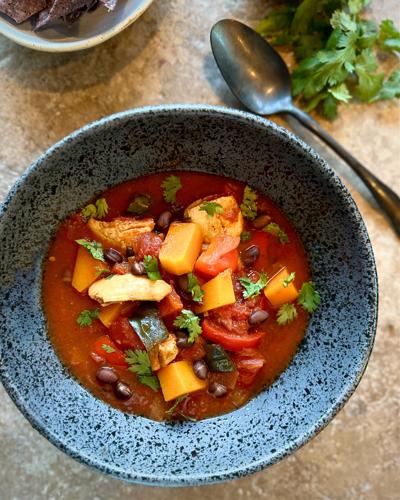 Ladle the stew into bowls. Serve with additional cilantro, tortilla chips, and diced avocado for garnishing.