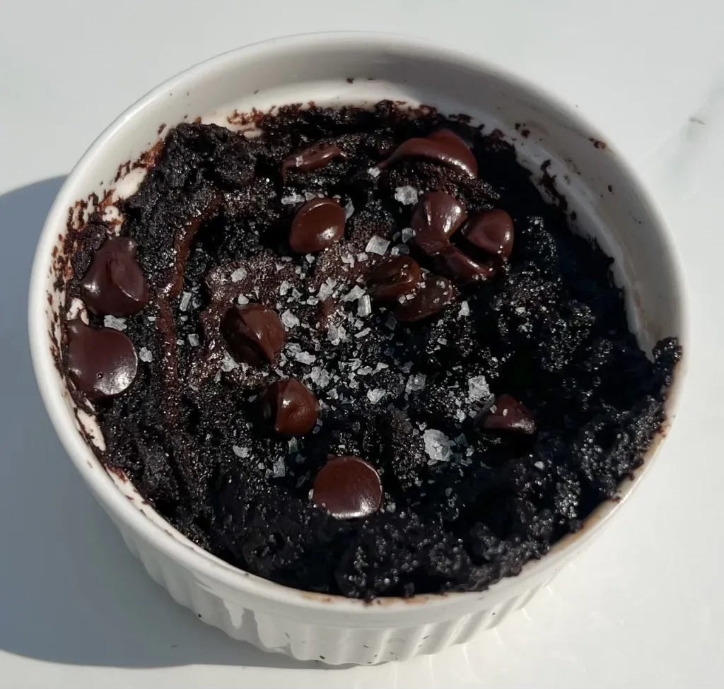 In a small bowl or mug, thoroughly mix all ingredients. Microwave for 1 1/2 to 2 minutes. Top with a small handful of chocolate chips (if using). You many enjoy your cake warm or place in the refrigerator for a thicker consistency.