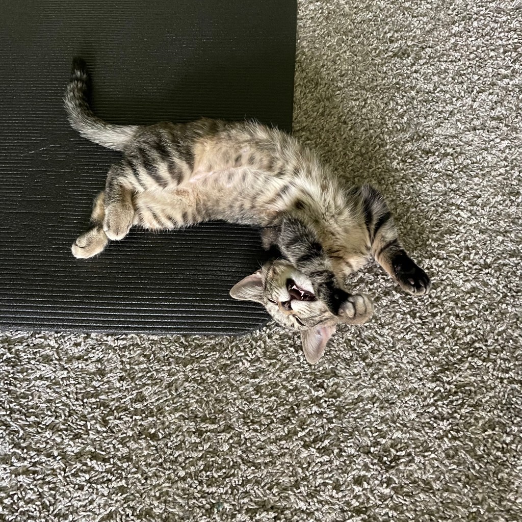 My soulmate cat, Cali crossed over the rainbow bridge (losing her battle with chronic kidney disease) on April 4, 2024. Exactly 10 days later a precious and playful brown tabby Β cat entered the world. A unique orange marking on her foot brings out the Cali (a calico cat) in her! Tali and Cali share other similarities as well: a love of water running out of the faucet, laying on my chest, and joining me on the mat for Peloton classes, to name a few!