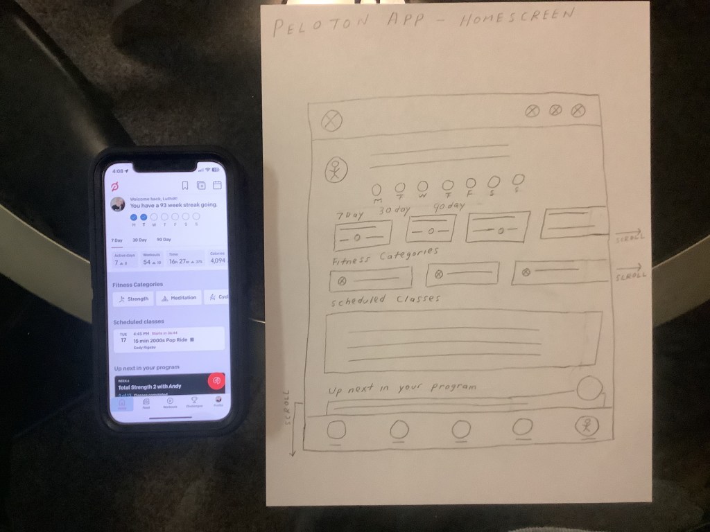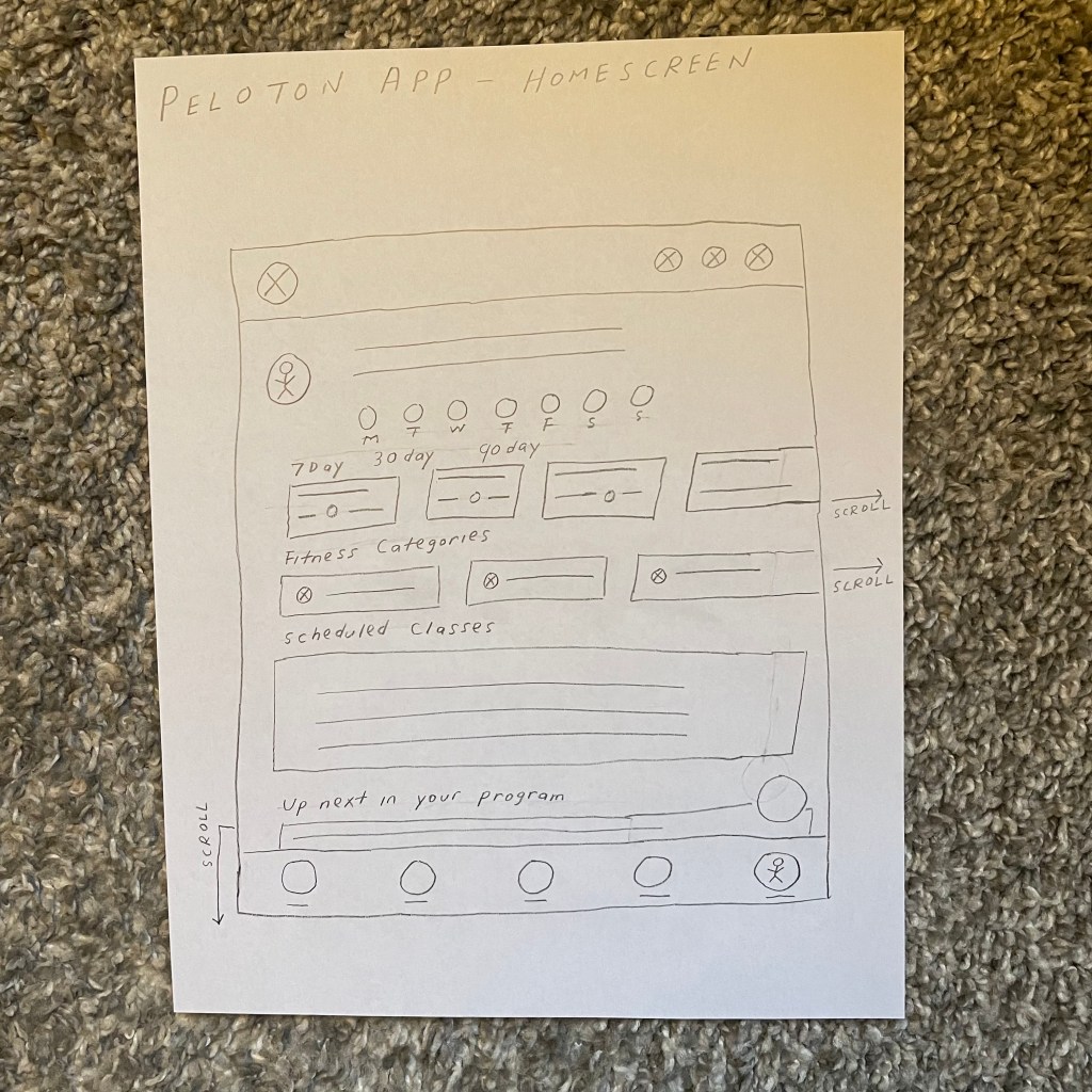 Wireframe Activity, Google UX Design Program through Coursera: Peloton App Homescreen